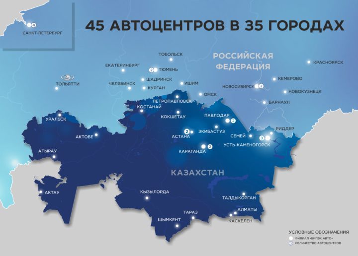 Задел для поставок автомобилей казахстанского производства на главный рынок Евразийского Союза – действующая сеть из 20 автоцентров в 15 городах России.